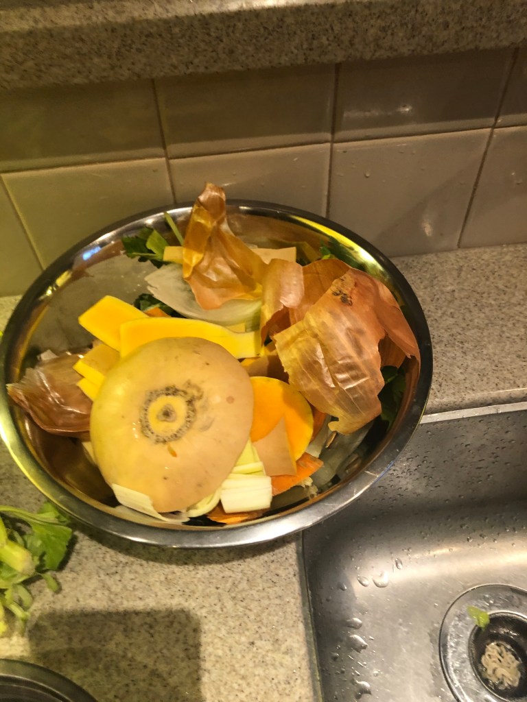 First I made the stock with the veg I was given. Basic more poix: White onion, celery, carrot. Since I was making leek soup, I didn’t bother with adding leeks to the mirepoix. I first sautéd the vegetables to get a darker stock, as is the way I like it. Roasted them will achieve the same effect
