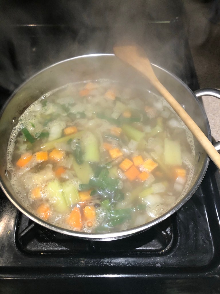 Then I added the strained stock and let simmer until the potatoes and squash were fork tender.