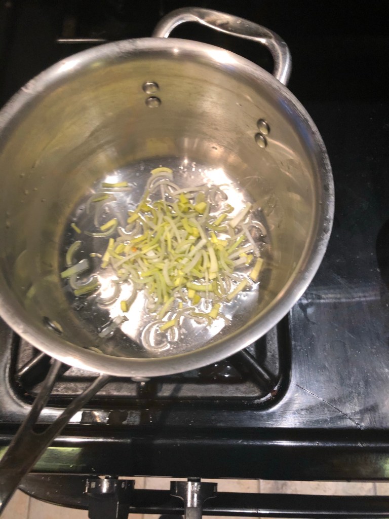I sweated the leeks, just to soften them. Adding a little bit of salt. I didn’t want to be picky about the greens or the white parts, because I didn’t want to waste anything at all