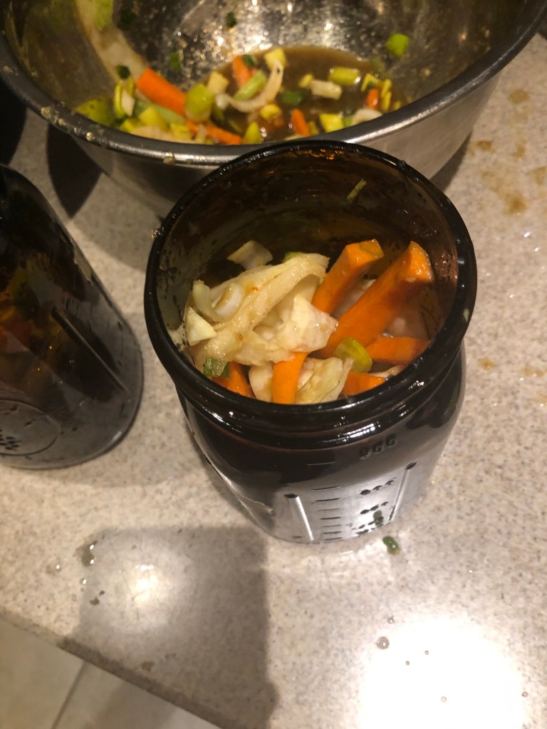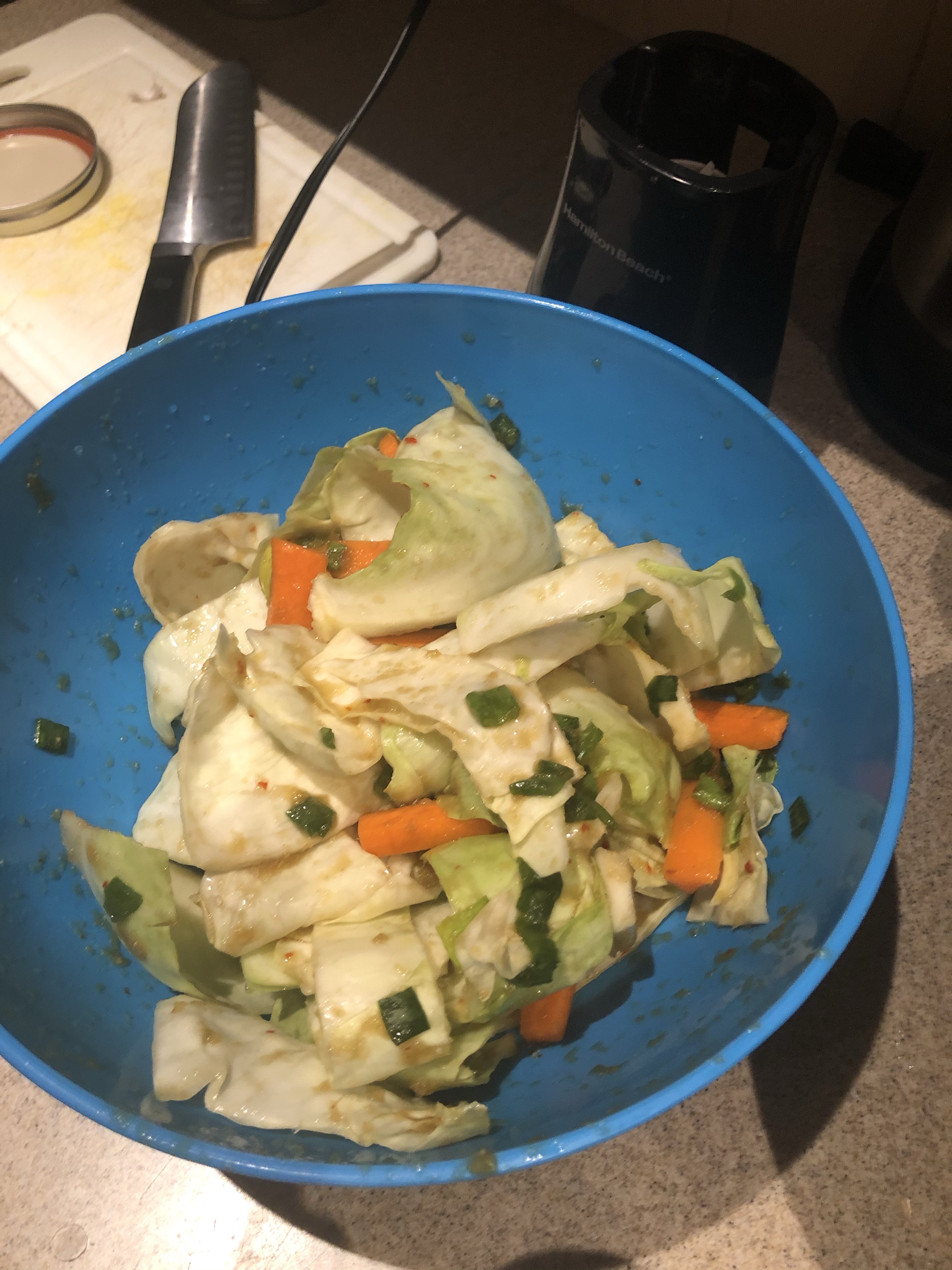 The process is as simple as it can be. With one hitch; The salt I had bought it much rockier than I thought it would be. It didn’t stick to the cabbage as much as I liked so it wasn’t wilted as it should be. But we meet be on. I loosely cut the veg, and I didn’t have Napa cabbage but regular worked just fine, batoned some carrots, added in some leek and green onion, mixed it all together and let it sit. after an hour it was ready to be jarred