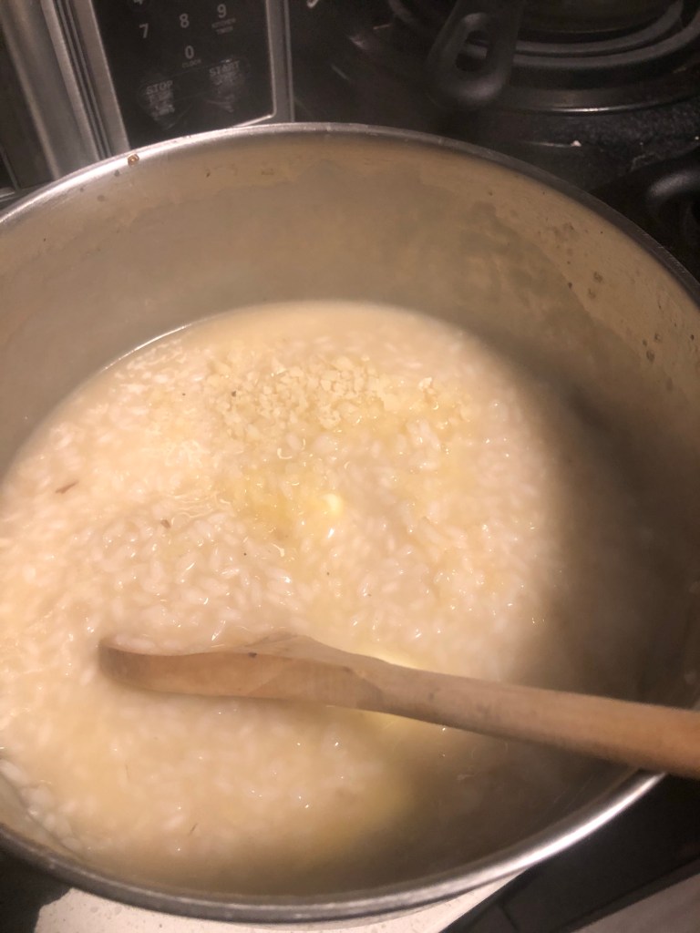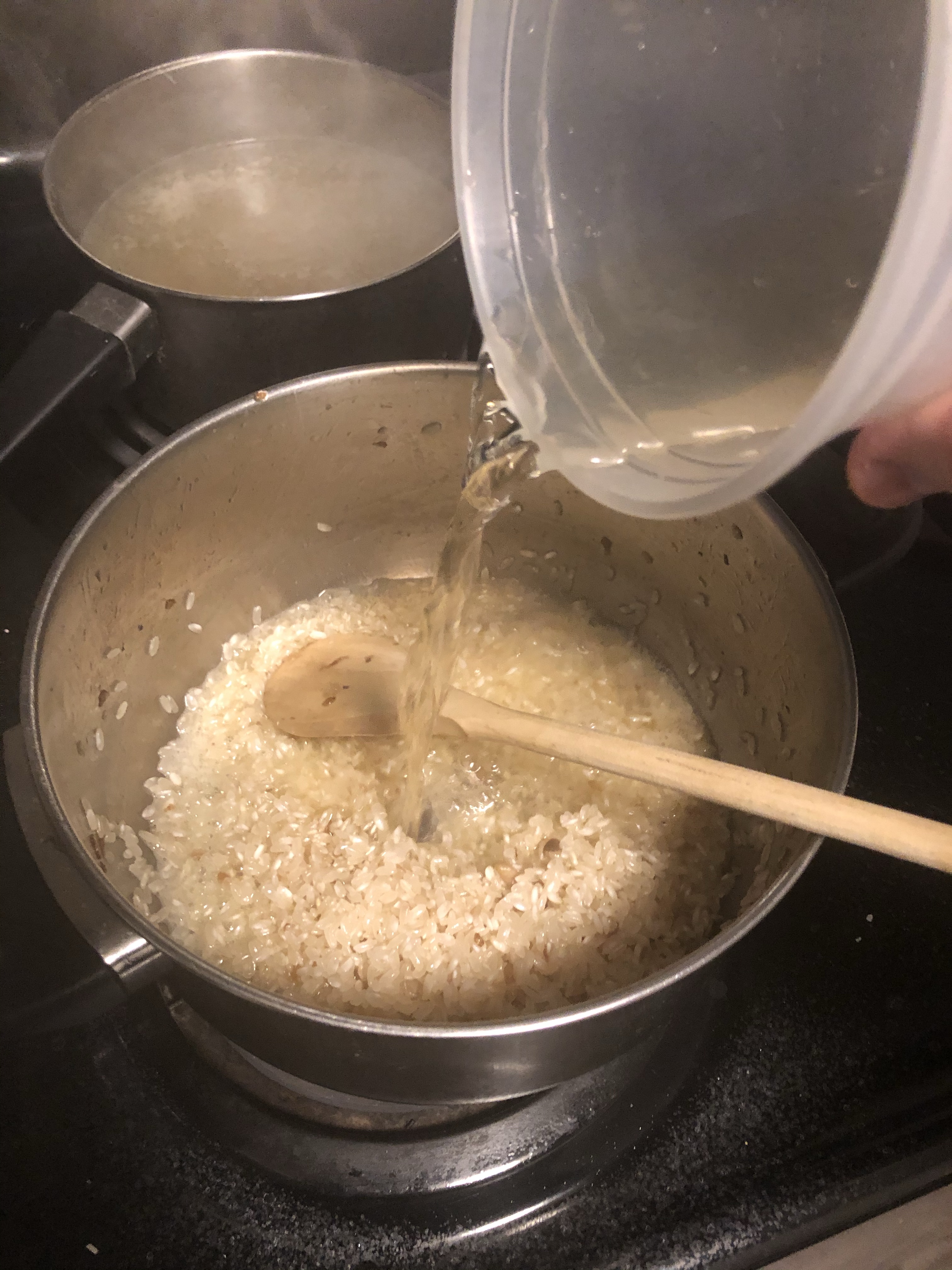 I waited until the wine was absorbed, then I added my very hot stock one ladle at a time until al dente