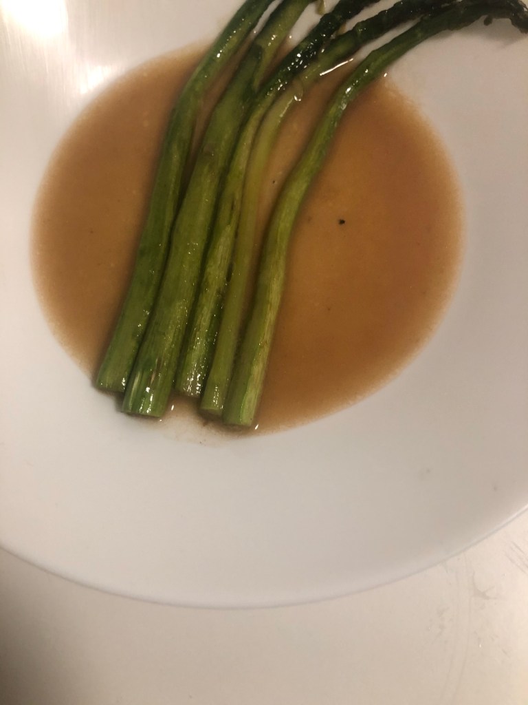 When ready to serve I dried the asparagus, and added it to a searing hot pan with oil, seasoned with pepper and salt.